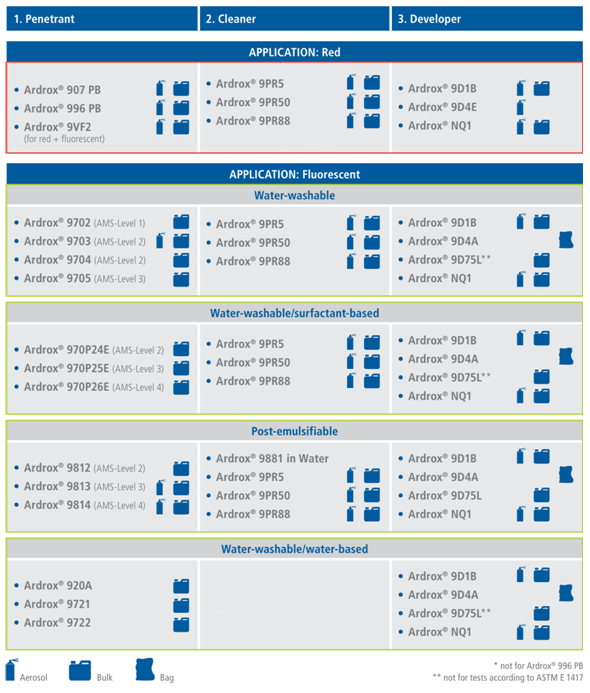 Ardrox 9720 Ardrox 9721 Ardrox 9722 | Liquidi Penetranti Fluorescenti, Lavabili con acqua, a Base acquosa, Livelli rispettivi 1/2,1,2 | AMS 2644 |